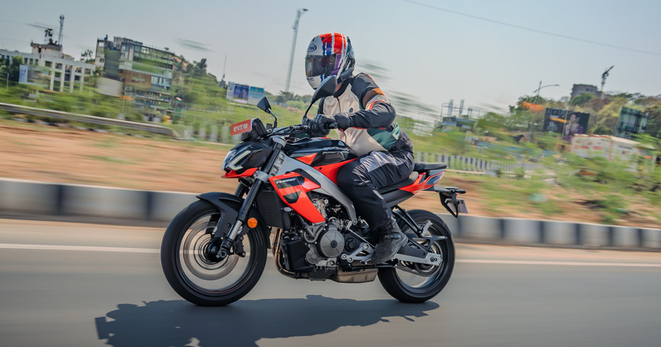 Open it up the throttle on the highway, and the Tuono 457 can cruise comfortably at 110kmph-120kmph with enough power in reserve for quick overtakes. The engine doesn’t feel stressed even at higher speeds. Wind protection is minimal compared to the RS, but the vibrations are kept in check, even at higher revs, making it good for longer distances as well. Very few vibes are felt when the bike is almost at the redline but nothing that is too bothersome.